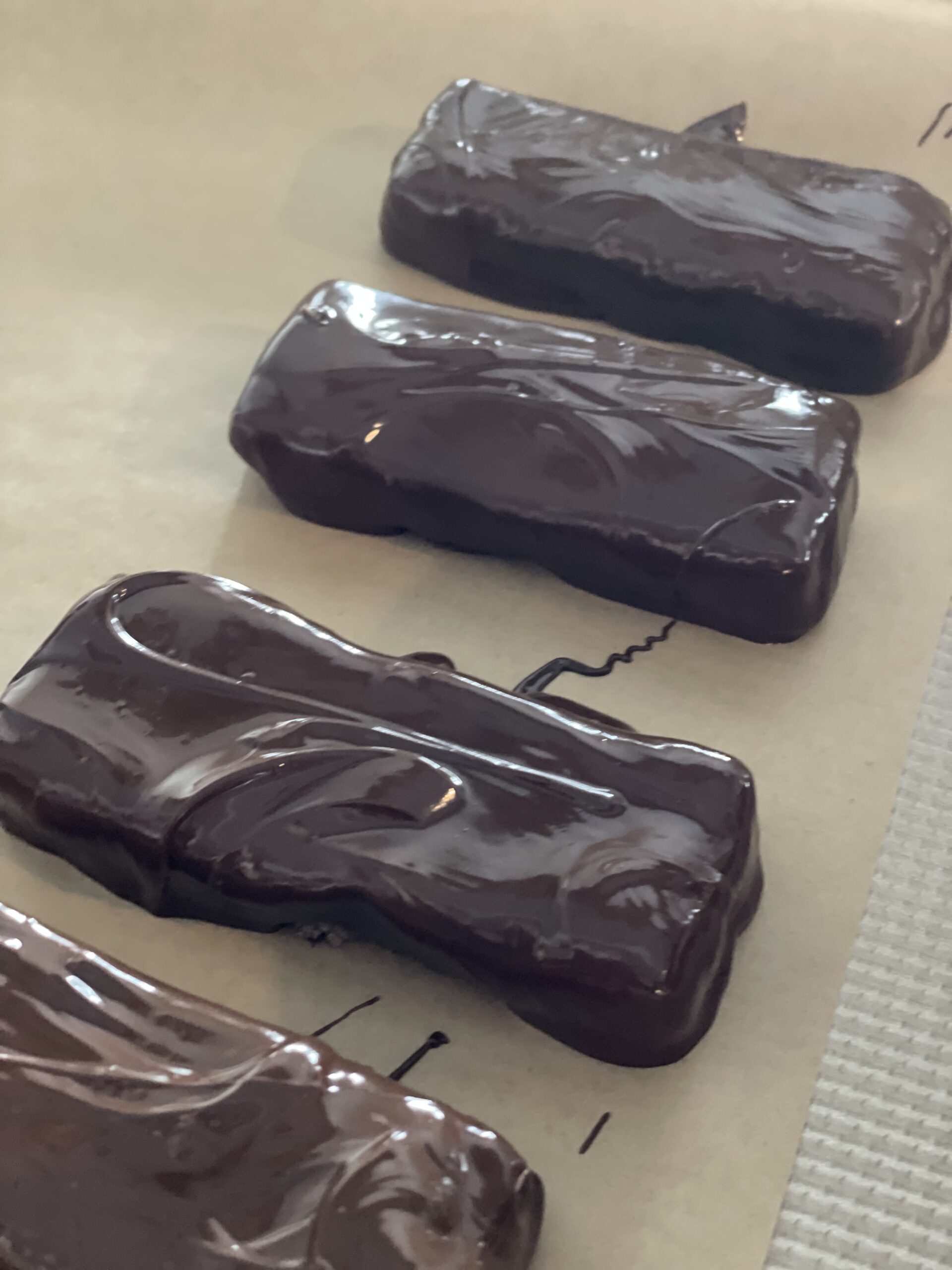 After the shortbread was baked and I layered/chilled the strawberry cheesecake, I dipped each rectangular piece in a bath of dark melted chocolate.